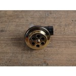 Polished brass overflow cover for bath with plastic hose fitting.
