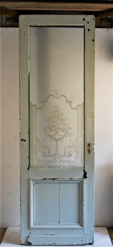 Tall painted pine door with fine etched glass panel over single panel with bolection moulding.