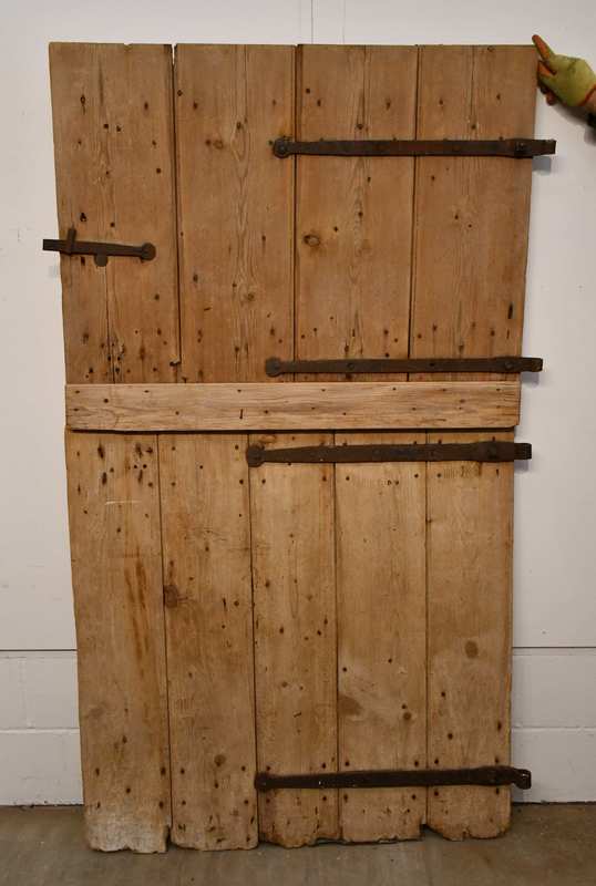 Stripped pine stable or barn door with latch and hinges.