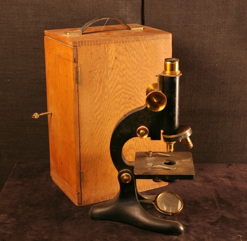 R & J Beck brass microscope with 2 lenses and original oak box.